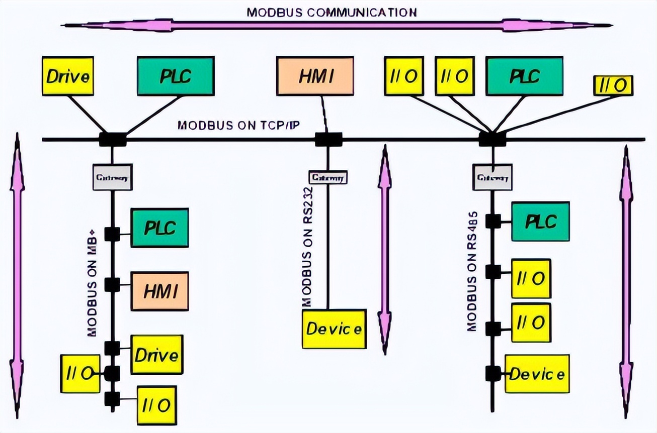 2、Modbus可以支持多種電氣接口,如RS-232、RS-485等,還可以在各種介質上傳送,如雙絞線、光纖、無線等。