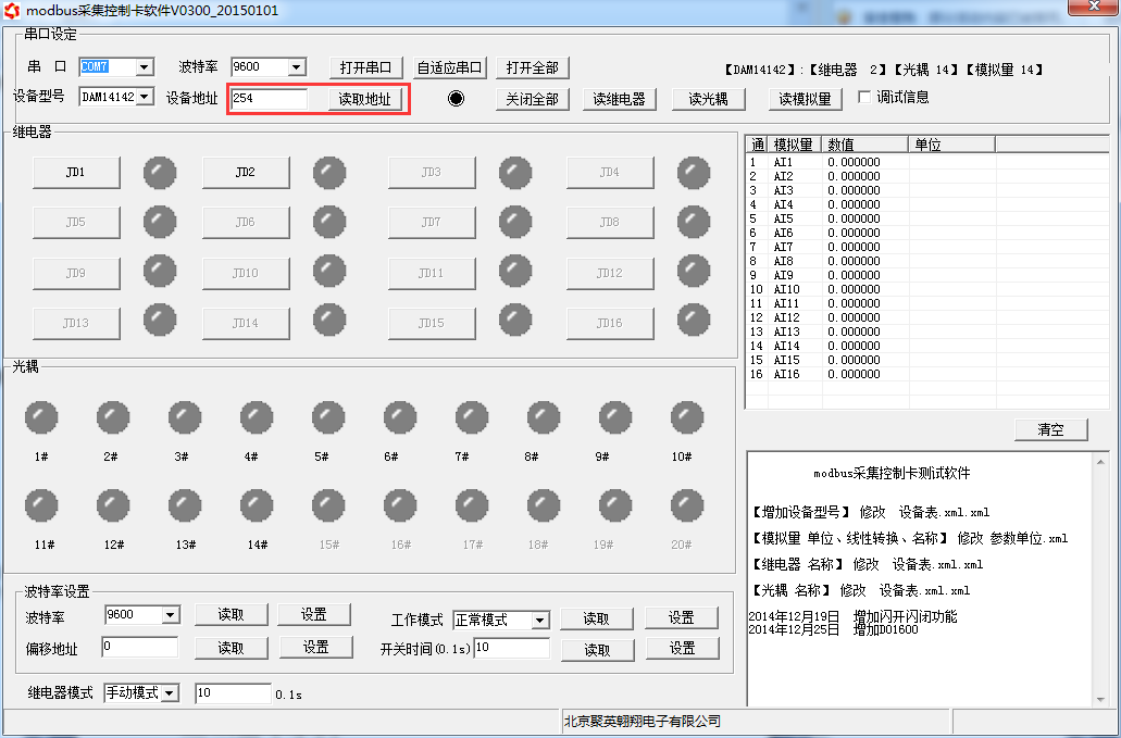 打開(kāi)“聚英翱翔DAM調(diào)試軟件”;串口設(shè)定欄:串口選擇您電腦對(duì)應(yīng)COM口,波特率選擇設(shè)備默認(rèn)波特率(9600)(未自己設(shè)置過(guò)波特率前),設(shè)備地址填寫(xiě)“254”(254為設(shè)備的廣播地址),設(shè)備型號(hào)選擇相對(duì)應(yīng)型號(hào),設(shè)置好以上設(shè)備的4個(gè)參數(shù)后點(diǎn)擊打開(kāi)串口,點(diǎn)擊繼電器按鈕“JD1”若繼電器反應(yīng)則連接成功。