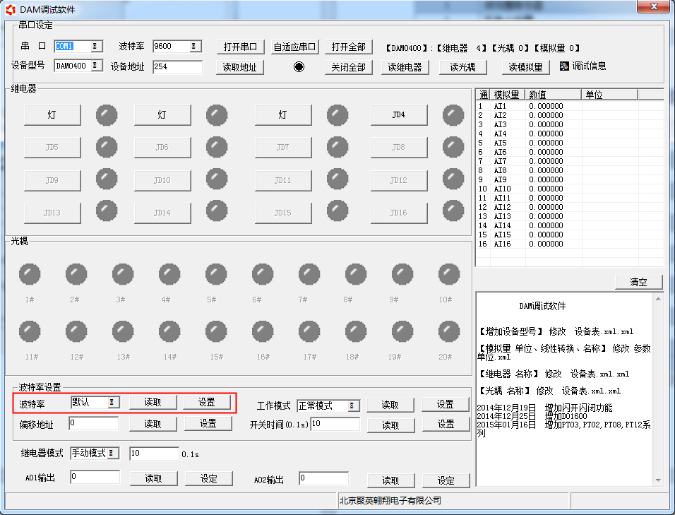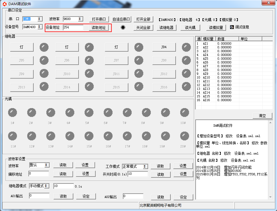 打開(kāi)“聚英翱翔DAM調(diào)試軟件”;串口設(shè)定欄:串口選擇您電腦對(duì)應(yīng)COM口,波特率選擇設(shè)備默認(rèn)波特率(9600)(未自己設(shè)置過(guò)波特率前),設(shè)備地址填寫(xiě)“254”(254為設(shè)備的廣播地址),設(shè)備型號(hào)選擇相對(duì)應(yīng)型號(hào),設(shè)置好以上設(shè)備的4個(gè)參數(shù)后點(diǎn)擊打開(kāi)串口,點(diǎn)擊繼電器按鈕“JD1”若繼電器反應(yīng)則連接成功。