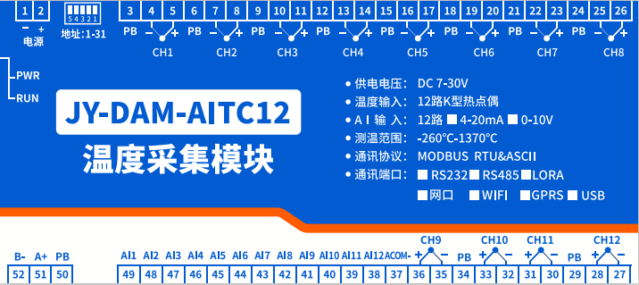 工業(yè)級(jí)溫度采集模塊,高精度24位AD轉(zhuǎn)換分辨率0.1,測溫精度1℃,采集頻率10HZ,支持多路同時(shí)采集,應(yīng)用于石油石化、冶金、電廠等行業(yè)