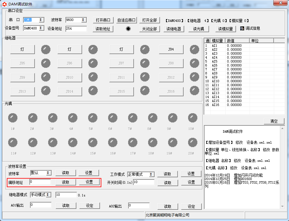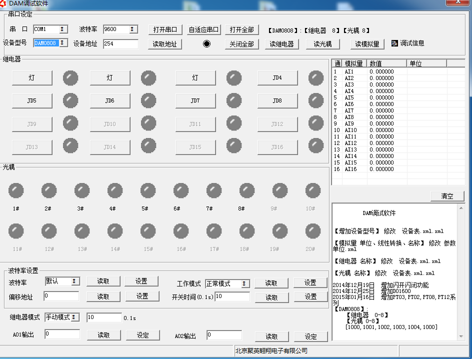 打開“聚英翱翔DAM調(diào)試軟件”;串口設(shè)定欄:串口選擇您電腦對應(yīng)COM口,波特率選擇設(shè)備默認波特率(9600)(未自己設(shè)置過波特率前),設(shè)備地址填寫“254”(254為設(shè)備的廣播地址),設(shè)備型號選擇相對應(yīng)型號,設(shè)置好以上設(shè)備的4個參數(shù)后點擊打開串口,點擊繼電器按鈕“JD1”若繼電器反應(yīng)則連接成功。