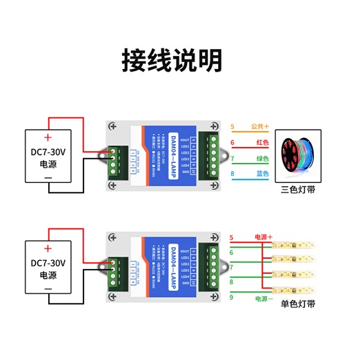 DAM04-LAMP是一款專用的4路調(diào)光模塊,采用MOS管形式進(jìn)行輸出不同占空比的周期信號(hào)以實(shí)現(xiàn)電壓的調(diào)節(jié),可實(shí)現(xiàn)調(diào)光、調(diào)壓、調(diào)速功能。上位機(jī)可使用485通訊進(jìn)行控制設(shè)備,實(shí)現(xiàn)家居燈光明暗、顏色變化等功能。