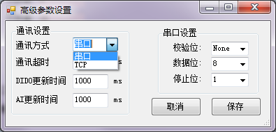 ②、根據(jù)當前設(shè)備選擇串口或TCP通訊方式,點擊保存,(注:TCP通訊方式下,僅設(shè)備的工作模式為TCP Server,即設(shè)備作為Server端)