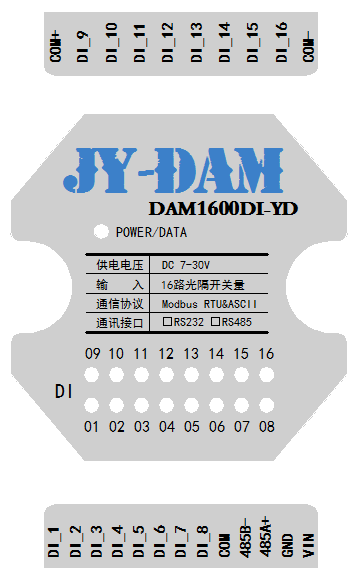 工業(yè)級(jí)開關(guān)量采集模塊 16路開關(guān)量采集(DI) DAM1600DI-YD,16路開關(guān)量輸入;支持干接點(diǎn)和NPN型開關(guān)量;支持RS232或隔離RS485通訊接口;支持標(biāo)準(zhǔn)modbus RTU協(xié)議;提供配套控制軟件;支持發(fā)送Modbus rtu/Ascii控制指令...