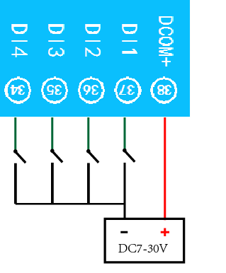 下圖中的電源部分為傳感器供電,AI1-AI8接傳感器信號正,ACOM-為傳感器信號負,ACOM+不用。