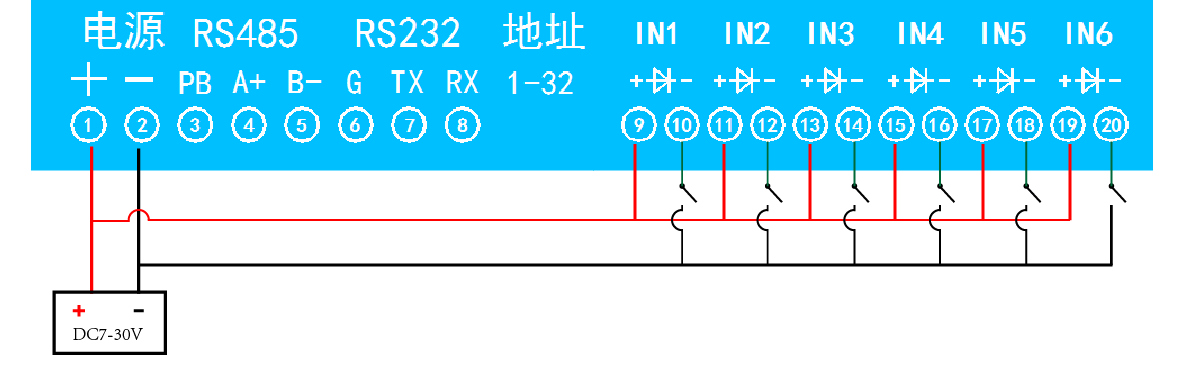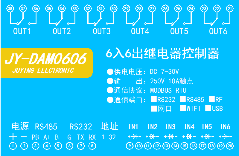 6路繼電器控制(DO)6路開關(guān)量采集(DI) DAM0606 工業(yè)級繼電器控制板 ,寬壓DC 7-30V供電電壓;6路繼電器控制輸出;6路開關(guān)量(干接點/NPN低電平)采集輸入;支持RS232或隔離RS485通訊接口;標準Modbus協(xié)議;支持Modbus R...