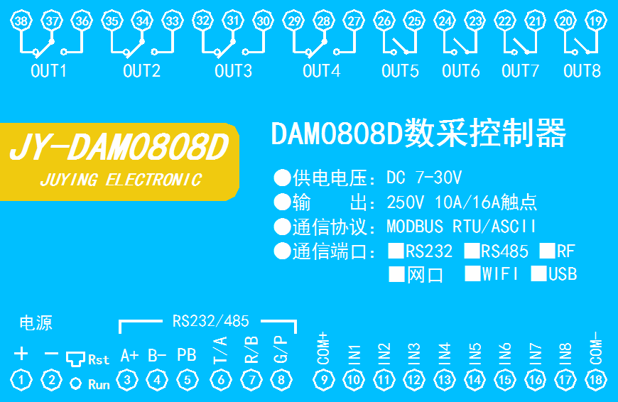 DAM繼電器控制模塊系列 1、繼電器輸出觸電容量30V10A-250V10A; 2、通訊接口分為RS232、RS485、USB、RJ45網(wǎng)口、網(wǎng)口+WIFI; 3、通訊協(xié)議采用Modbus協(xié)議,通訊波特率:2400、4800、9600...