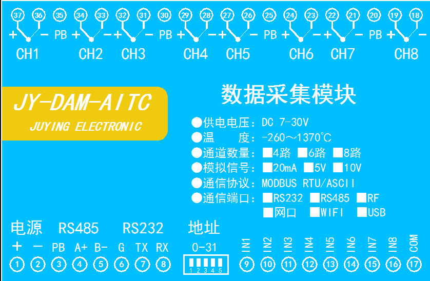 工業(yè)級溫度采集模塊 DAM-AITC,8路模擬量采集8路熱電偶溫度數(shù)據(jù)采集,高精度24位AD轉換分辨率0.1,測溫精度1℃,采集頻率10Hz●支持多路同時采集,應用于石油石化、冶金、電廠等溫度檢測控制的場景。