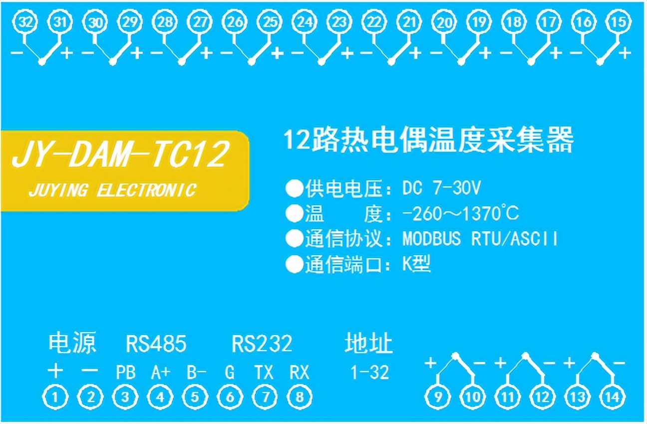 12路K型熱電偶溫度數(shù)據(jù)采集DAM-TC12 工業(yè)級(jí)溫度采集模塊,高精度24位AD轉(zhuǎn)換分辨率0.1,測(cè)溫精度1℃,●采集頻率10HZ,支持多路同時(shí)采集,應(yīng)用于石油、化工、鋼鐵、電廠等溫度檢測(cè)