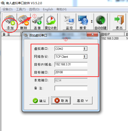 注:添加的虛擬串口不能與本機已有的串口沖突,目標IP即設備的IP,虛擬串口參數(shù)要求與章節(jié)4中配置的設備參數(shù)一致。