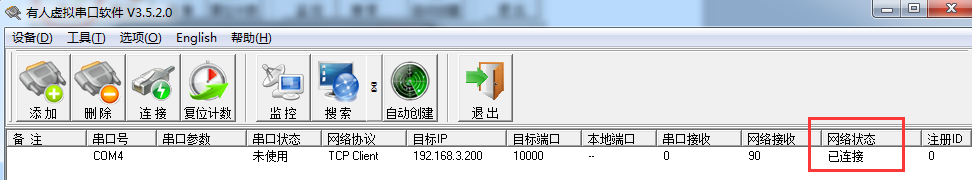 虛擬串口添加完成后,建立的虛擬串口狀態(tài)為已連接狀態(tài),如下所示:
