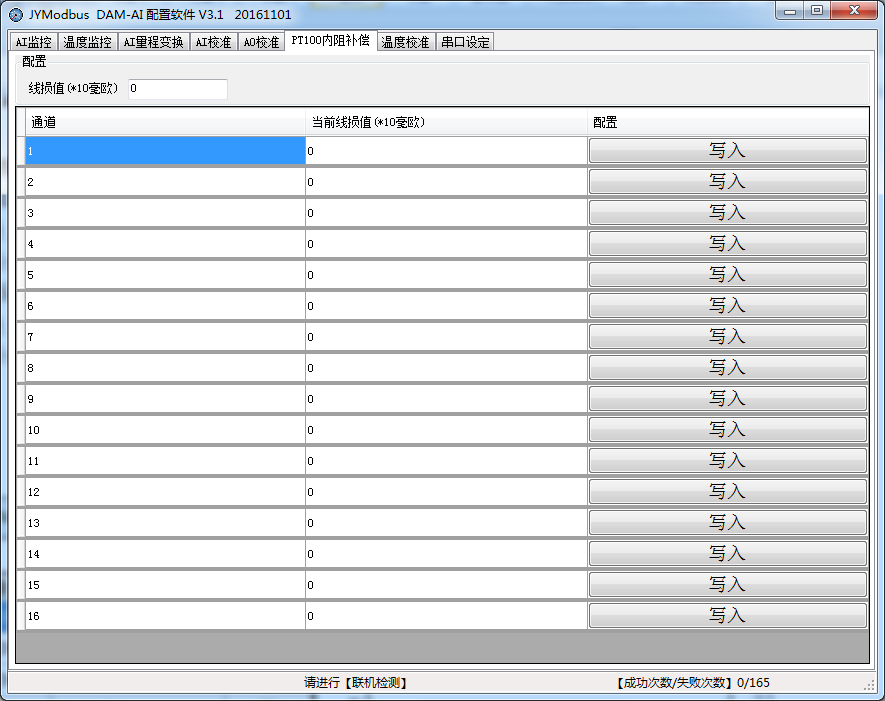 反之實(shí)際溫度是20.1度,第一路顯示溫度是20度,說溫度低了0.1度,對(duì)應(yīng)PT100電阻是38毫歐,在線損值輸入框填入-3.8,點(diǎn)擊第一路后邊的
