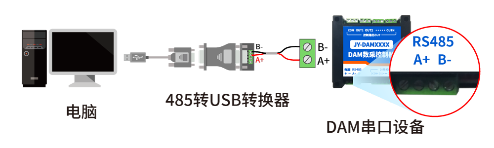 電腦自帶的串口一般是RS232,需要配232-485轉(zhuǎn)換器(工業(yè)環(huán)境建議使用有源帶隔離的轉(zhuǎn)換器),轉(zhuǎn)換后RS485為A、B兩線,A接板上A端子,B接板上B端子,485屏蔽可以接GND。若設(shè)備比較多建議采用雙絞屏蔽線,采用鏈型網(wǎng)絡(luò)結(jié)構(gòu)。