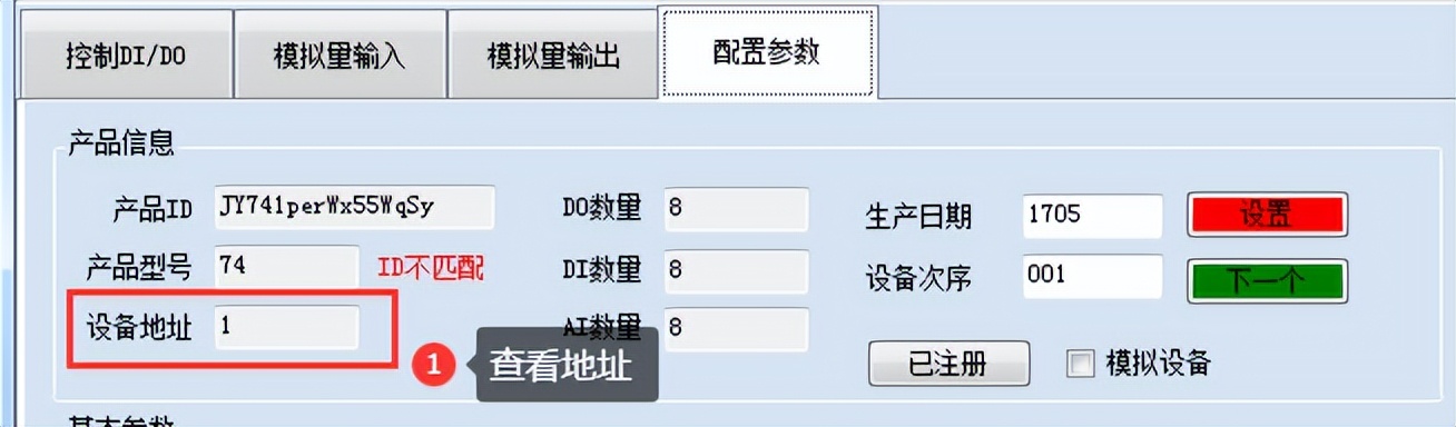 設(shè)備正常通訊后,初始設(shè)備地址寫入254,然后點擊軟件上方“配置參數(shù)”即可讀到設(shè)備的當(dāng)前地址。